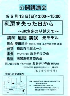 [収録エピソード] まずはいきさつから。なぜ、めちゃめちゃ一般ピープルな私がこのドラマにエキストラ出演出来たかと言うと、それは「フジテレビクラブ」のおかげである。 フジテレビクラブはTV局のファンクラブとして去年の4月に応募が始まり年会費1800円を払うと年4回、広報誌が送られてきて、そのほかにもイベントのご案内等も送られてくる。 その中の企画の一つとして「番組登録制度」と言うものがあり観覧や制作協力、番組リサーチ協力などでフジテレビの番組作りに参加できると言うものである。 私はこの制度に登録して、今回のエキストラ出演となったわけである。 と、言うことでこの企画はフジテレビからの要請があって初めて更新できるため定期的な更新はできません。 では、今回の収録秘話に移りたいと思います。 私が現場に着いたのが集合時間10分前の12時50分だった。 すると入り口の前にはたくさんの人がいてかなり後ろの方に並んで待つこと30分、出演依頼ハガキと会員カードのチェックをうけて、やっと中に入れた。中にはどう考えても500人以上の人が入っていて、座るとすぐに拍手のシーンの撮影が始まった。 ちなみに私はこのドラマを一回も見たことがないのでどうゆう状況設定なのかわけがわからず拍手していた。唯一わかっていることは主人公でモデルの風間美咲(稲森)が乳ガンで片方の乳房の除去手術を行ったぐらいなので、つんくや中井貴一の役どころがまったくわかってなかった。(いまも・・・) 最初の拍手のシーンが終わりスタッフから説明があった。 「みなさんの設定はこの講演会に興味をもってきている人の役ですので、その事をよく頭に入れて演技してください。」 と言われてあくびなどは言語道断だろうなと思いながら次のシーンへ。 その間にビラ(小道具)をもらい、次は(というか最後までなんだけど)壇上で美咲が話しているのを聞くシーン。 小道具のビラ ![]() 話している最中に堀慎太郎(つんく)が会場から出ていくところで説明のための練習ではスタッフの人がやっていたのでわからなかったが本番になると本物のつんくが出てきて演じていた。(当然だが) 私が座っている席は後ろの方。つんくは座席側からみて右前方の壁によりかかっているので私のところは撮影していないのでじっくりつんくをみる。 次は美咲をとるカット。本物の稲森が出てきて壇上で台詞を読み上げる。自分の席からではよく見えなかったが声はよく聞こえた。(マイク無し)ここでも話の最中につんくの方を見ながら読むシーンがあったのでつんく登場。 このカットを取り終わると一発OKがでて、つんくの出番終了。 いよいよ今度は観客席のカット撮り。するとスタッフから、 「『・・・ないんだって』のシーンはじょじょに拍手をするように。そして『・・・の疑いがある』のシーンは心配するような表情で、『でも、違いました。』のところではホッとした表情。」と細かい演技指導がありまた、 「おんなじ話を何回も聞くけど毎回初めて聞くような感じで、あとなるべくオーバーに演技をやってください。ドラマなんで・・・」と話があり、本番スタート。 このシーンは15分近くあるのでテストカットも入れると30分以上の長丁場になる。何度も襲いかかる睡魔を相手にじっと稲森を見つめ続け、オーバー気味にうなづいたり、前に乗り出してみたり、となんとか一発OK! そして、トイレ休憩。今回の収録には女性が9割近くいたので女子トイレは大混雑。しまいには男子トイレにまで入ってくるおばさんまで現れた。 次は、観客席から壇上を取るカット。と言う時に中井貴一が中に入ってきた。おおっ!と思いながらも本番に入って背中で演技。 これが終わるとスタッフがあわただしくあちこちにレールを引いて観客席にいる役者さんのカット。役者さんは前方の席にしかいないので後ろの席の私はぼーっと見ているだけ。 テストカットが終わった時にスタッフから 「フジテレビクラブの皆様に朗報です。後ろの席の方は収録が終わりましたので帰って結構です。ご協力ありがとうございました。」とあり、帰りにセミダブルの脚本ノート、目玉マークのストラップ、そして崎陽軒のシウマイ弁当を貰って帰った。 脚本ノート